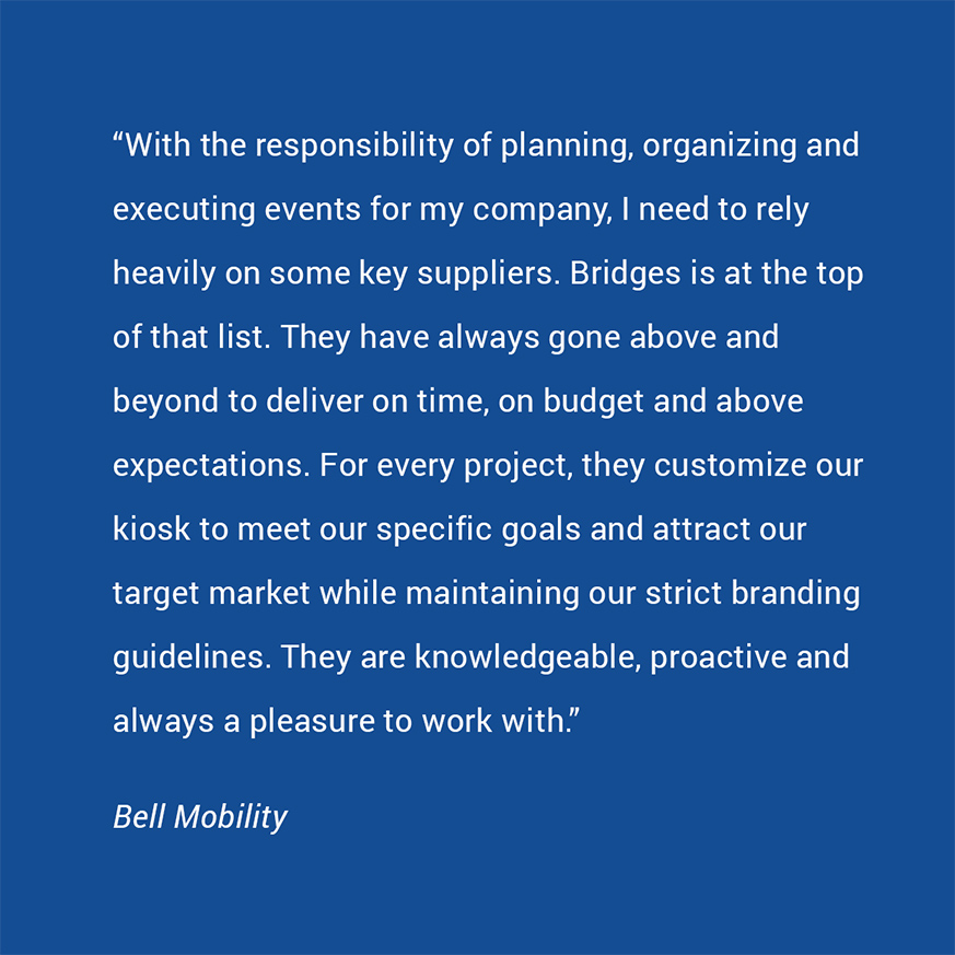 With the responsibility of planning, organizing and executing events for my company, I need to rely heavily on some key suppliers. Bridges is at the top of that list. They have always gone above and beyond to deliver on time, on budget and above expectation. For every project, they customize our kiosk to meet our specific goals and attracts our target market while maintaining our strict branding guidelines. They are knowledgeable, proactive and always a pleasure to work with. Bell Mobility.