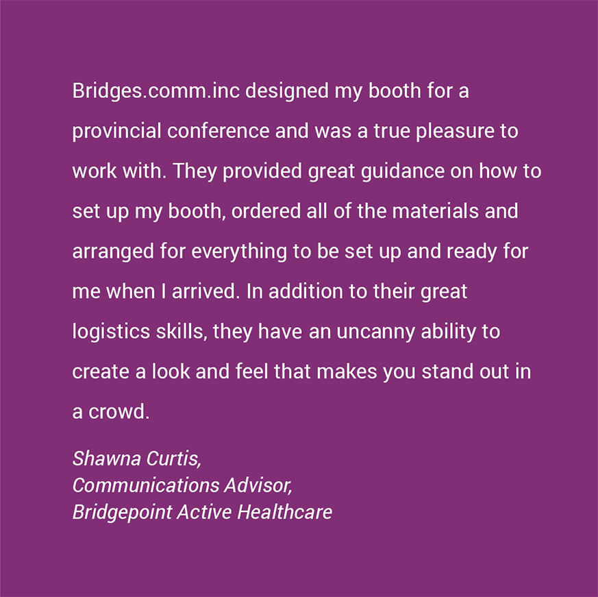 bridges.comm.inc designed my booth for a provincial conference and was a true pleasure to work with. They provided great guidance on how to set up my booth, ordered all of the materials and arranged for everything to be set up and ready for me when i arrived. In addition to their great logistics skills, they have an uncanny ability to create a look and feel that makes you stand our in a crowd. Shawna Curtis, Communications advisor, bridgepoint active healthcare.